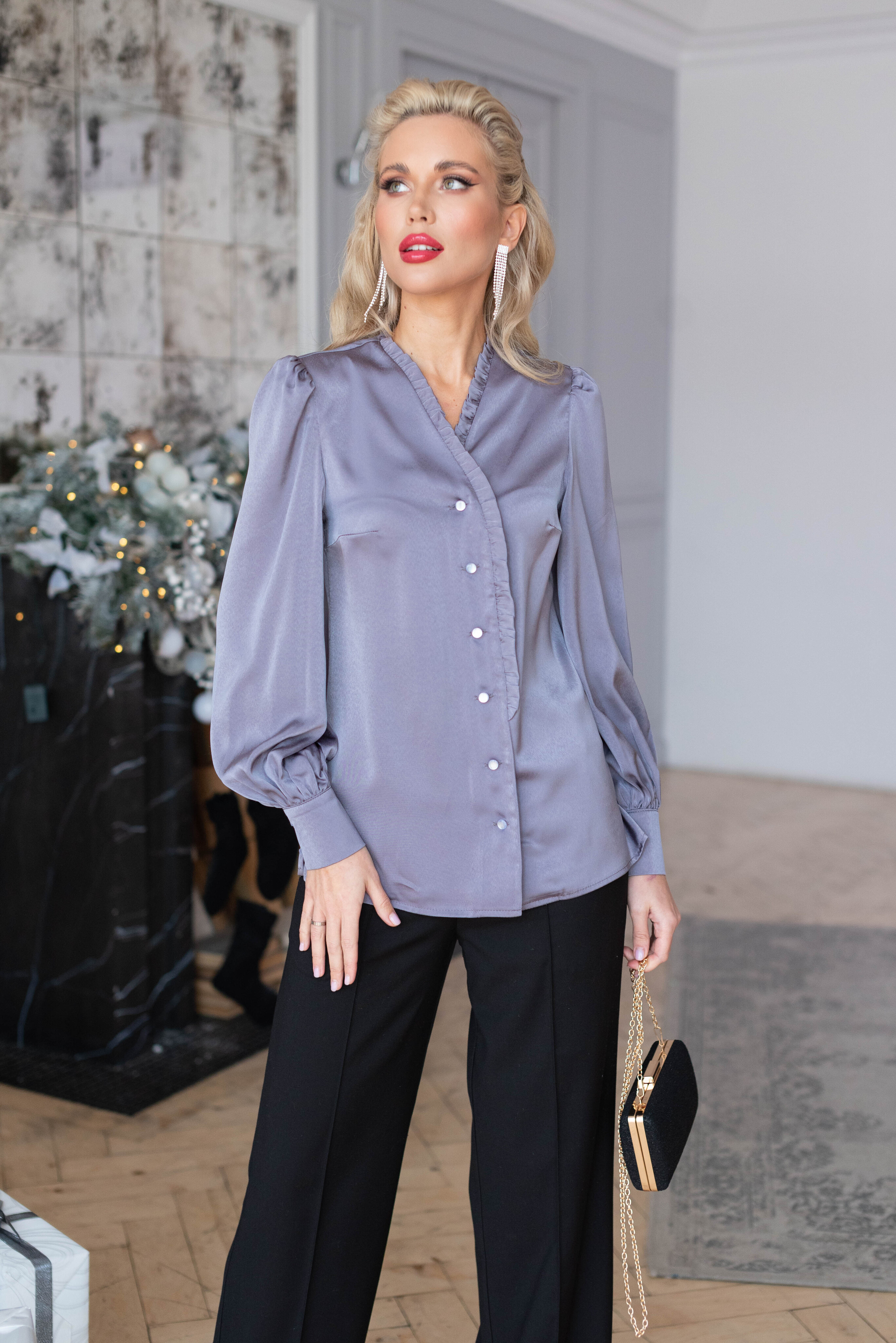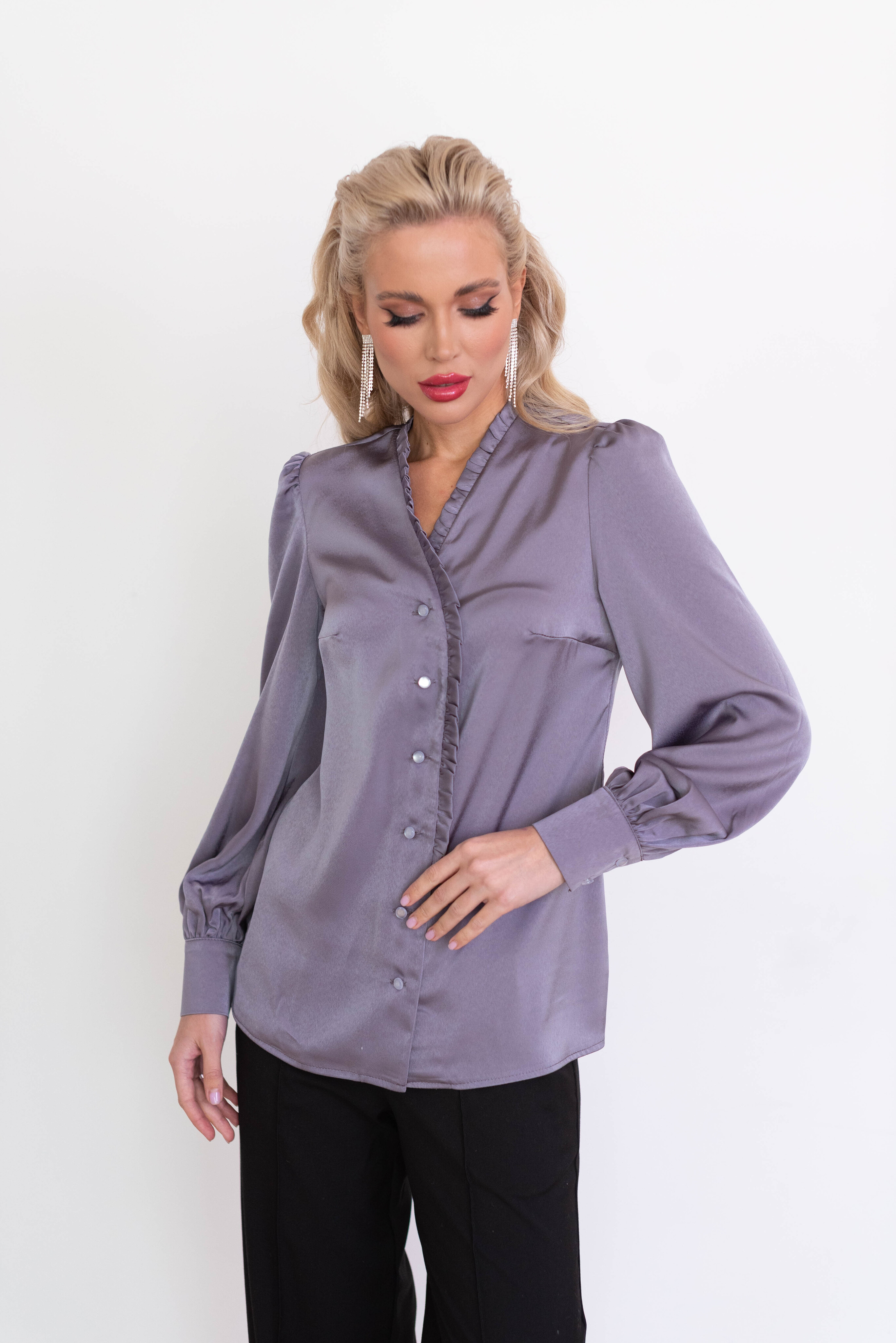 Нежная шелковая блуза с с широкими рукавами и манжетами в цвете графит. Выполнена в классическим стиле с оттенком романтики и женственности. Блуза прямого кроя с V-образным вырезом горловины. Вырез украшают аккуратные ненавязчивые рюши.