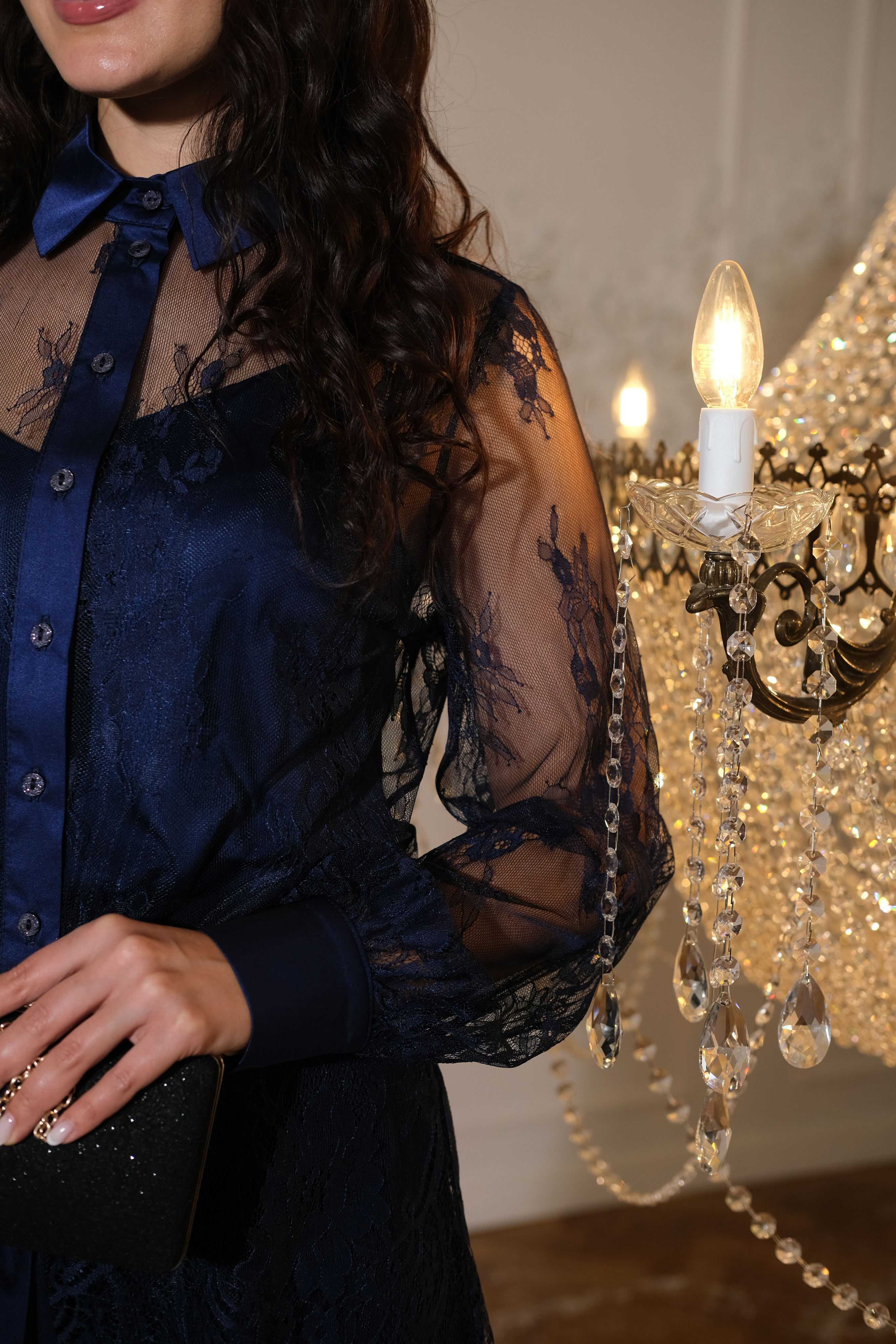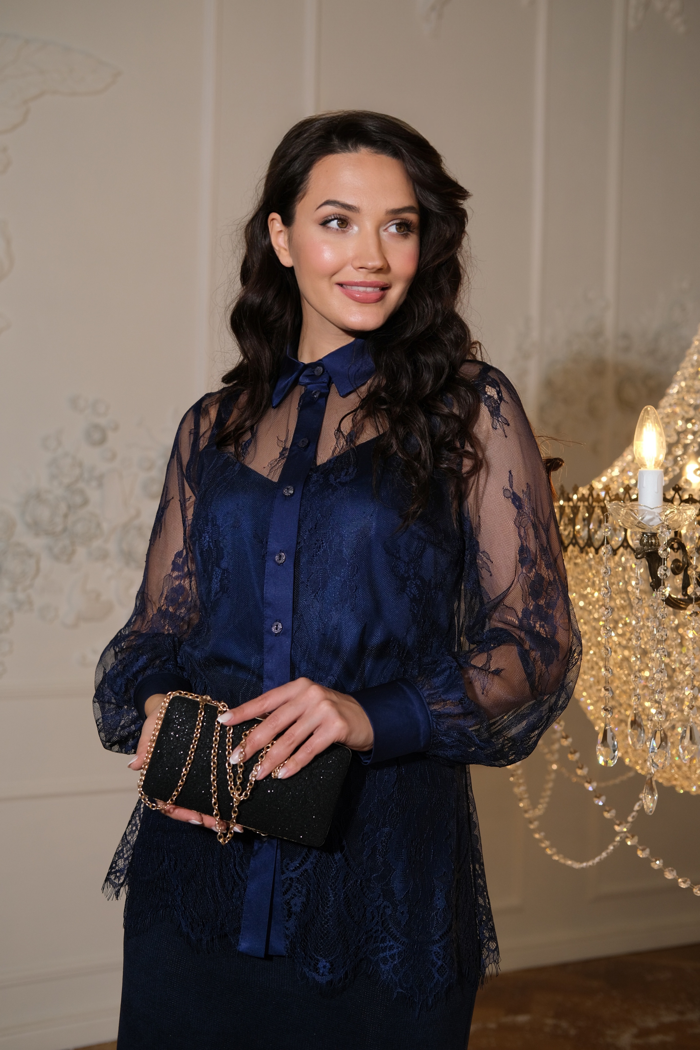 Эффектная кружевная блуза, выполнена в классическим стиле с оттенком романтики и женственности. Блуза прямого кроя, горловина с классическим острым воротником из шелковистой ткани. Так же из шелка выполнены манжеты и планка застежка. Добавьте к блузе синий классический топ из нашей коллекции, чтобы получить более сдержанный образ. Низ блузы украшает красивый кружевной край.