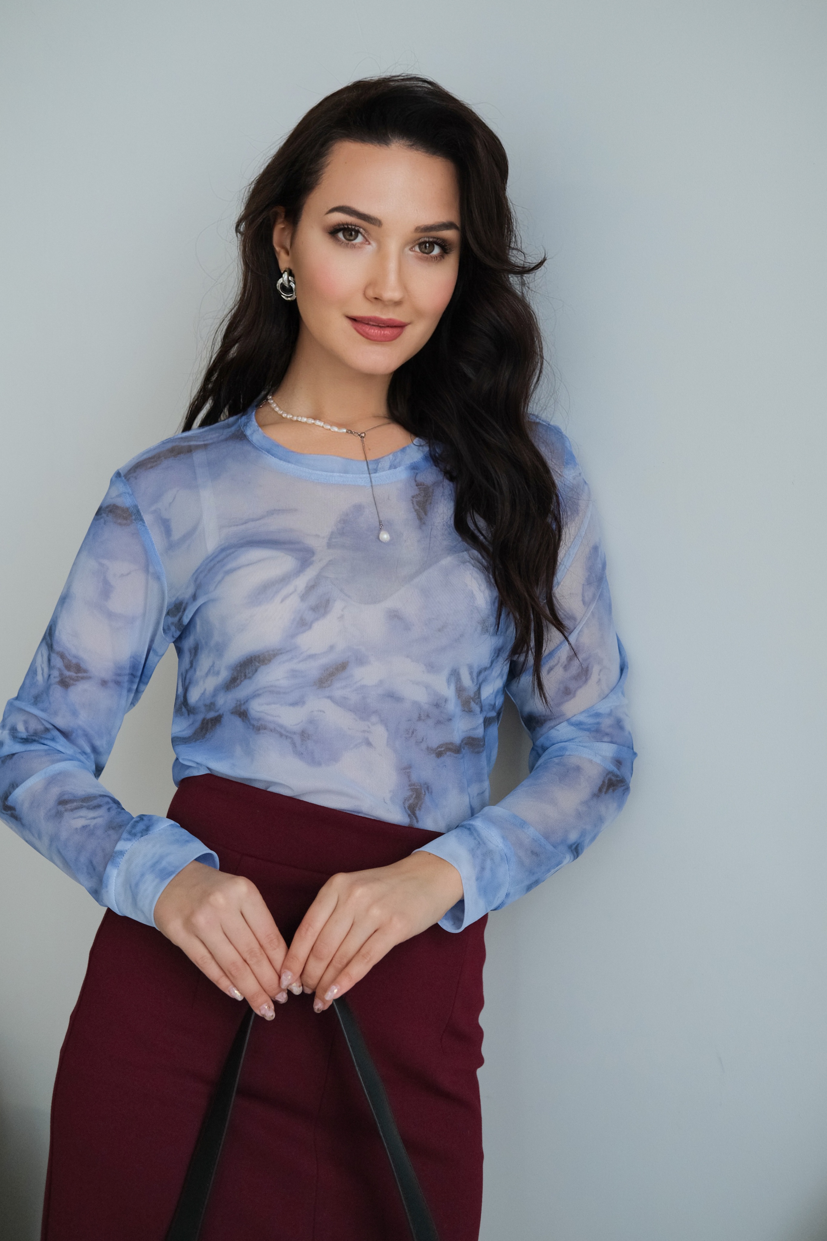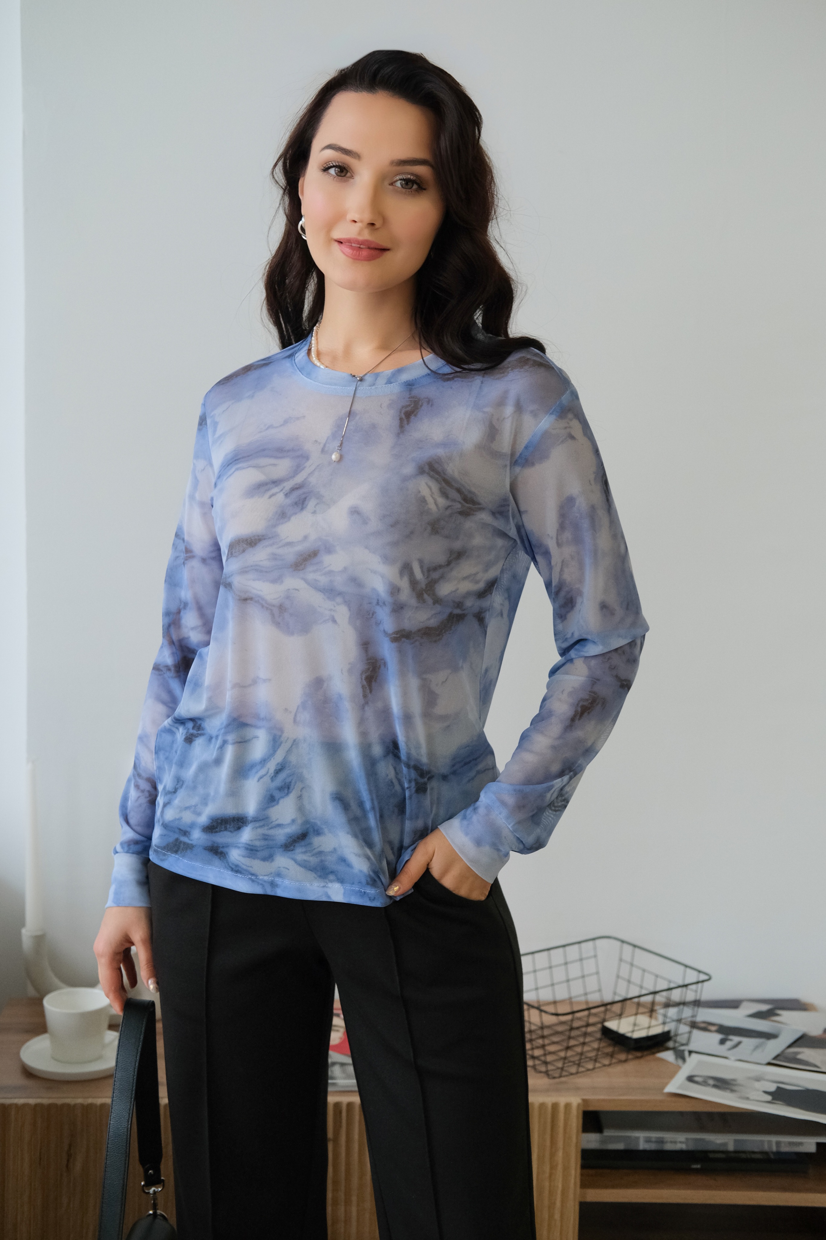 Базовый лонгслив в красивом голубом цвете. Это тот случай, если наскучили водолазки и футболки. Мы выбрали трикотаж из полупрозрачной сетки - такой материал комфортно облегает и не растягивается со временем.