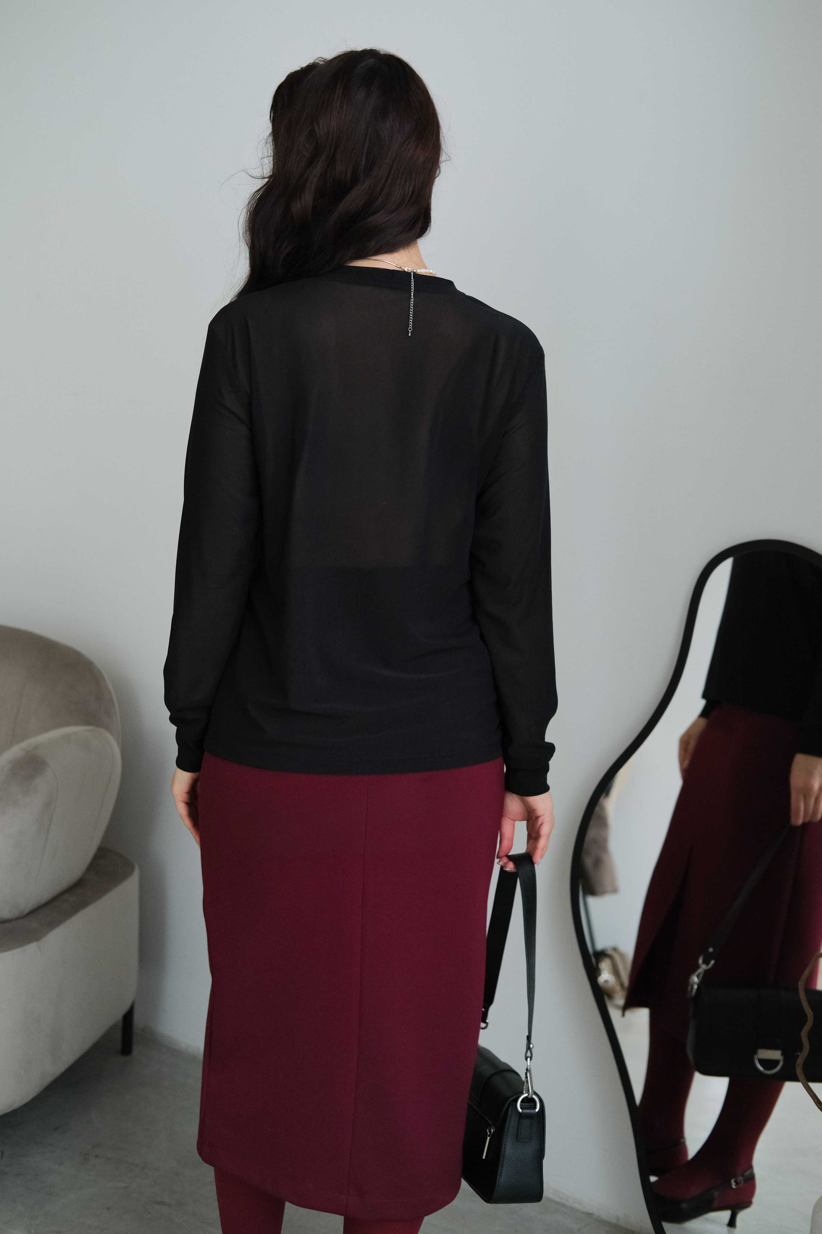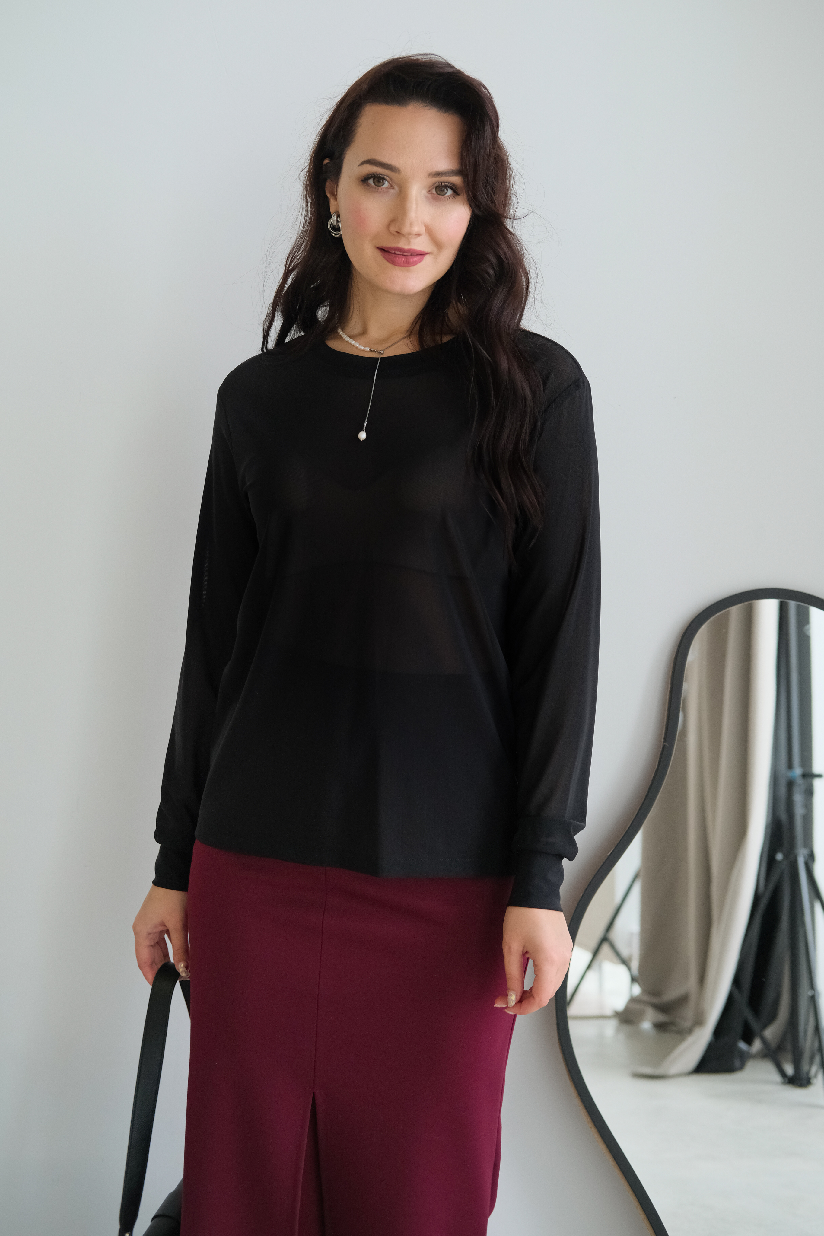Базовый лонгслив в черном цвете. Это тот случай, если наскучили водолазки и футболки. Мы выбрали трикотаж из полупрозрачной сетки - такой материал комфортно облегает и не растягивается со временем.