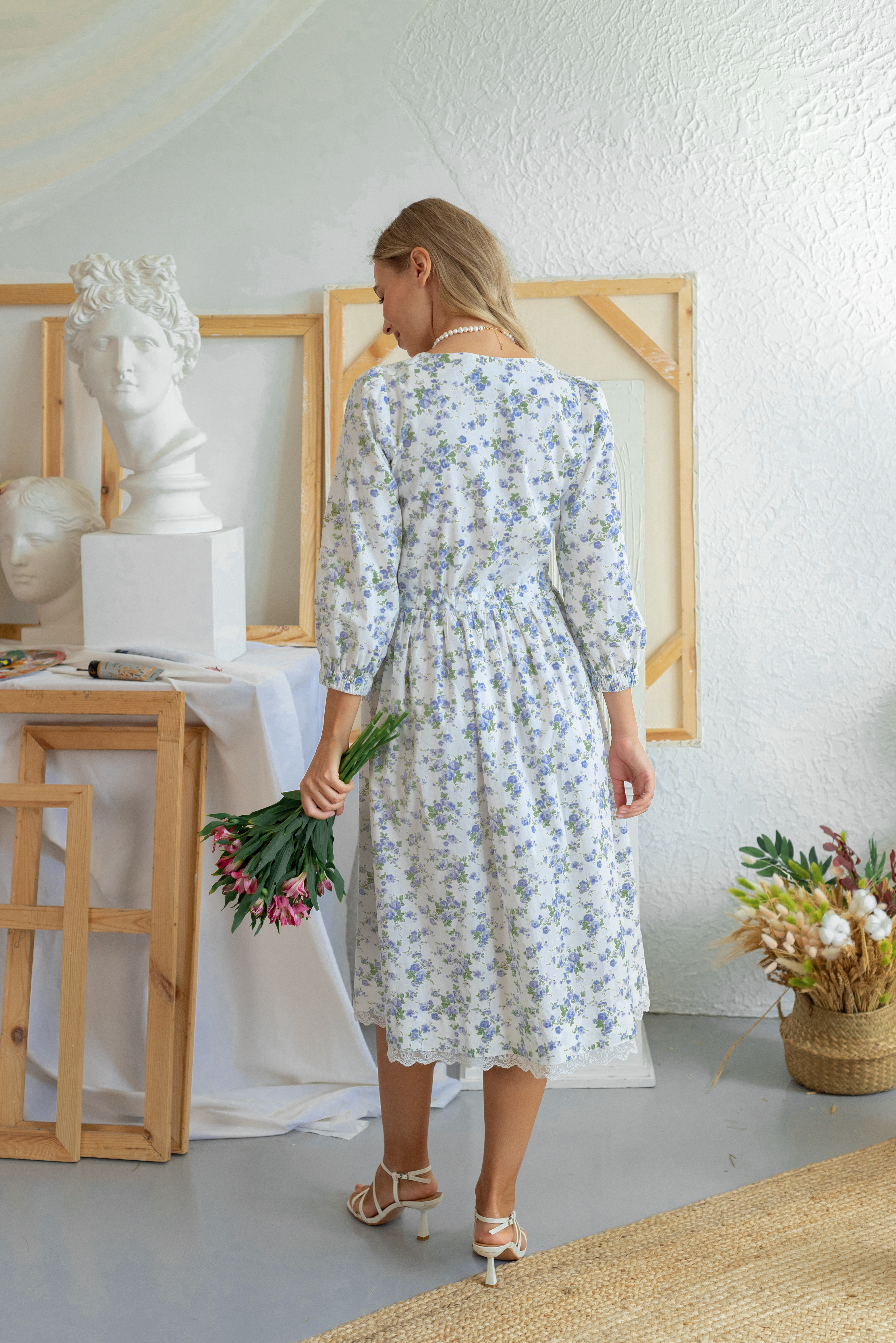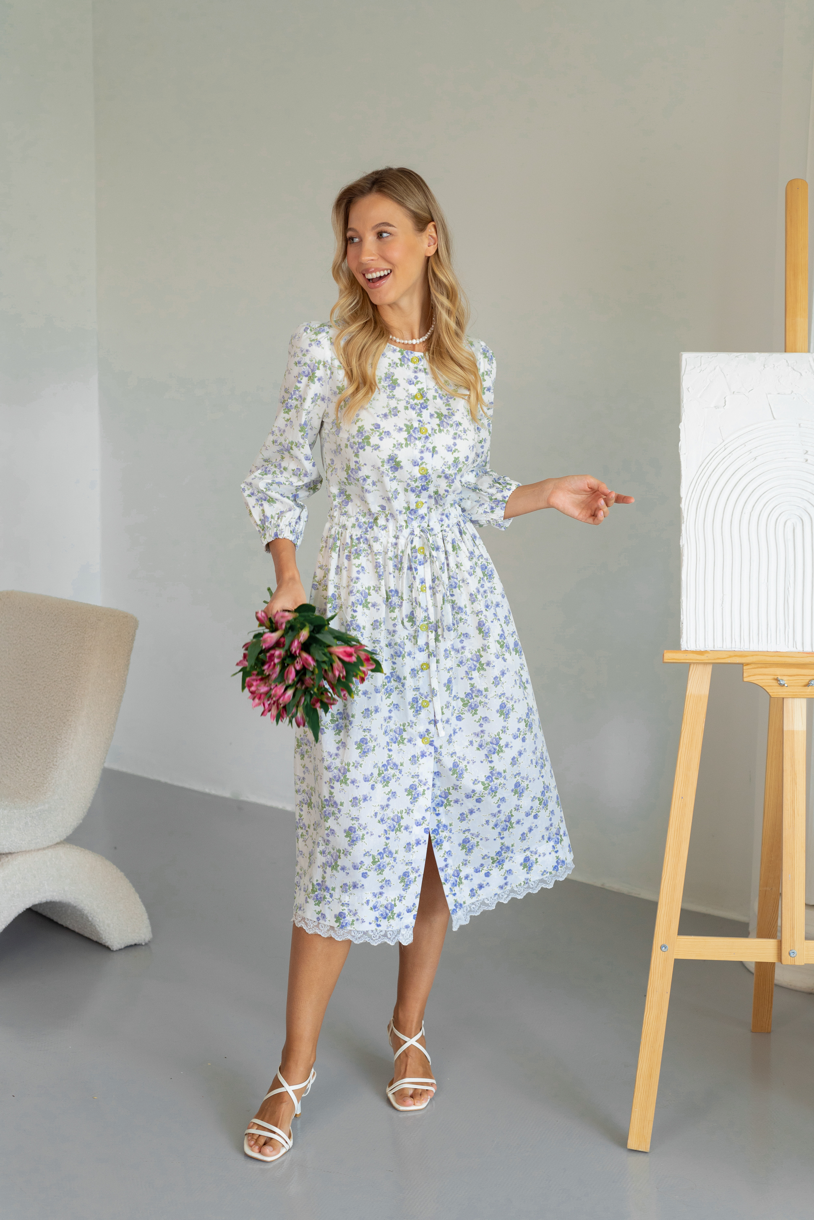 Воздушное платье из хлопка с нежным и красивым принтом. Модель с умеренной свободой. Низ платья украшает кружево. Широкий укороченный свободный рукав для свободы действий. Дополняют образ контрастные желто-зеленые пуговицы. Платье отрезное по линии талии и собрано на кулиску. В таком платье вы всегда будете ловить восторженные взгляды.