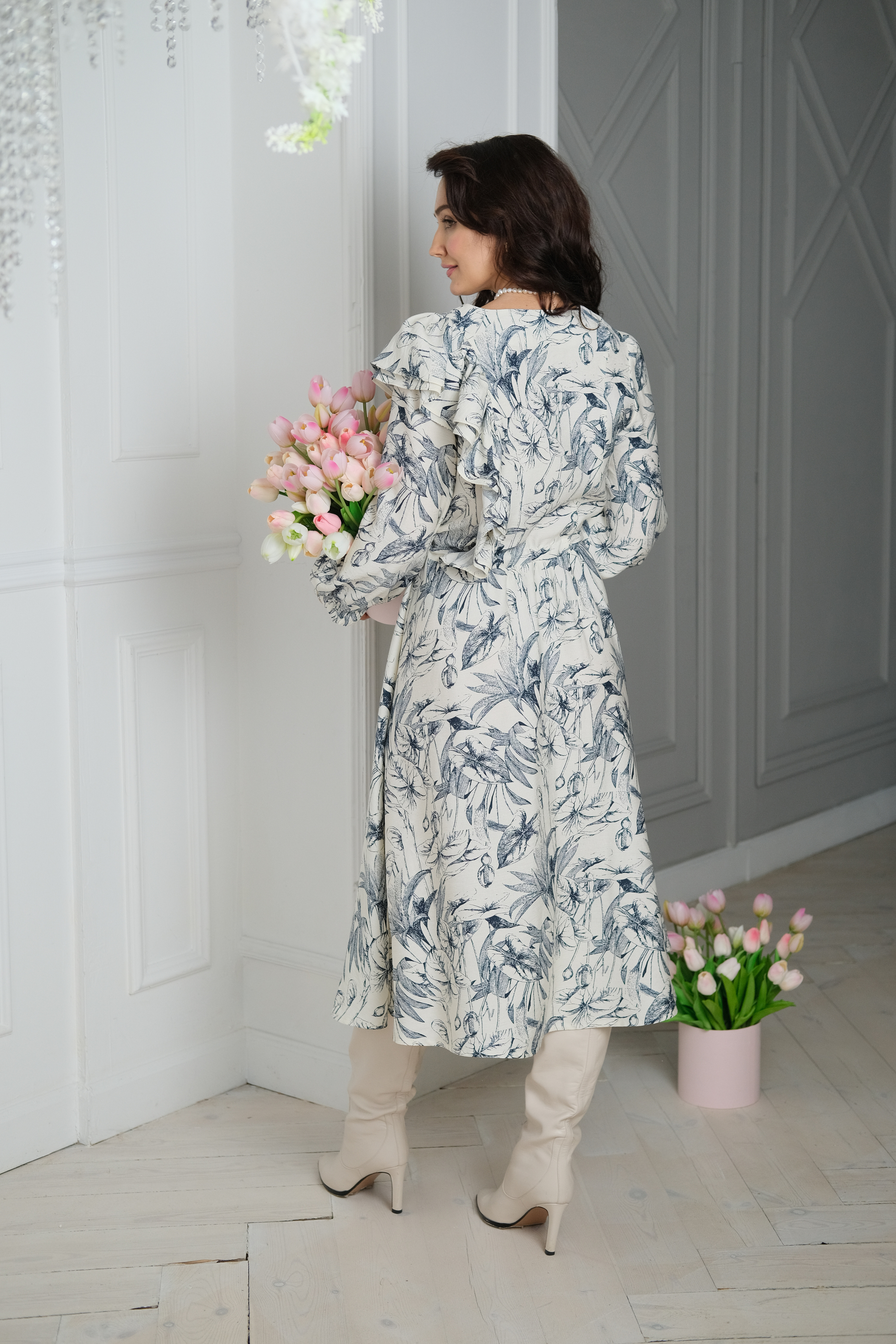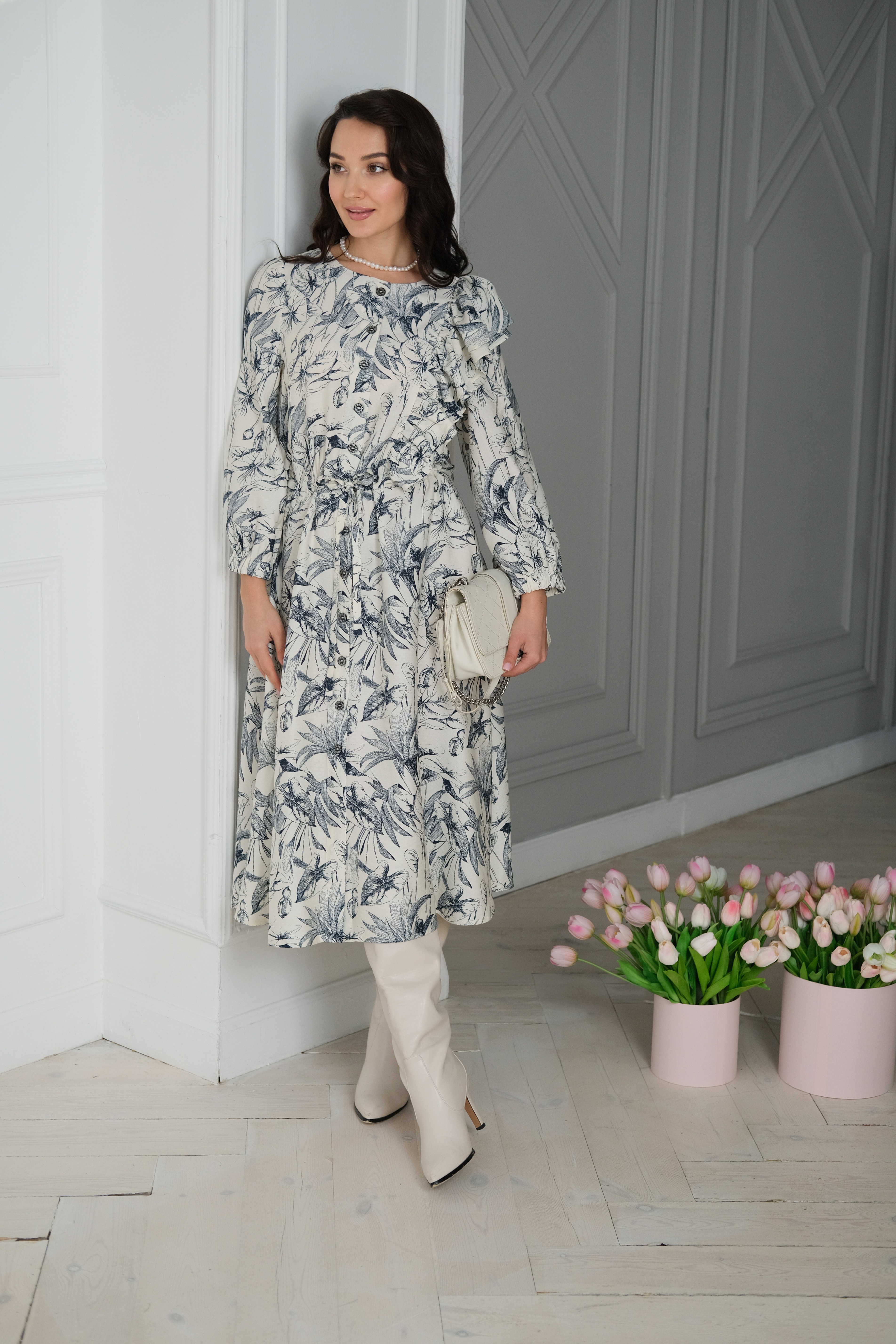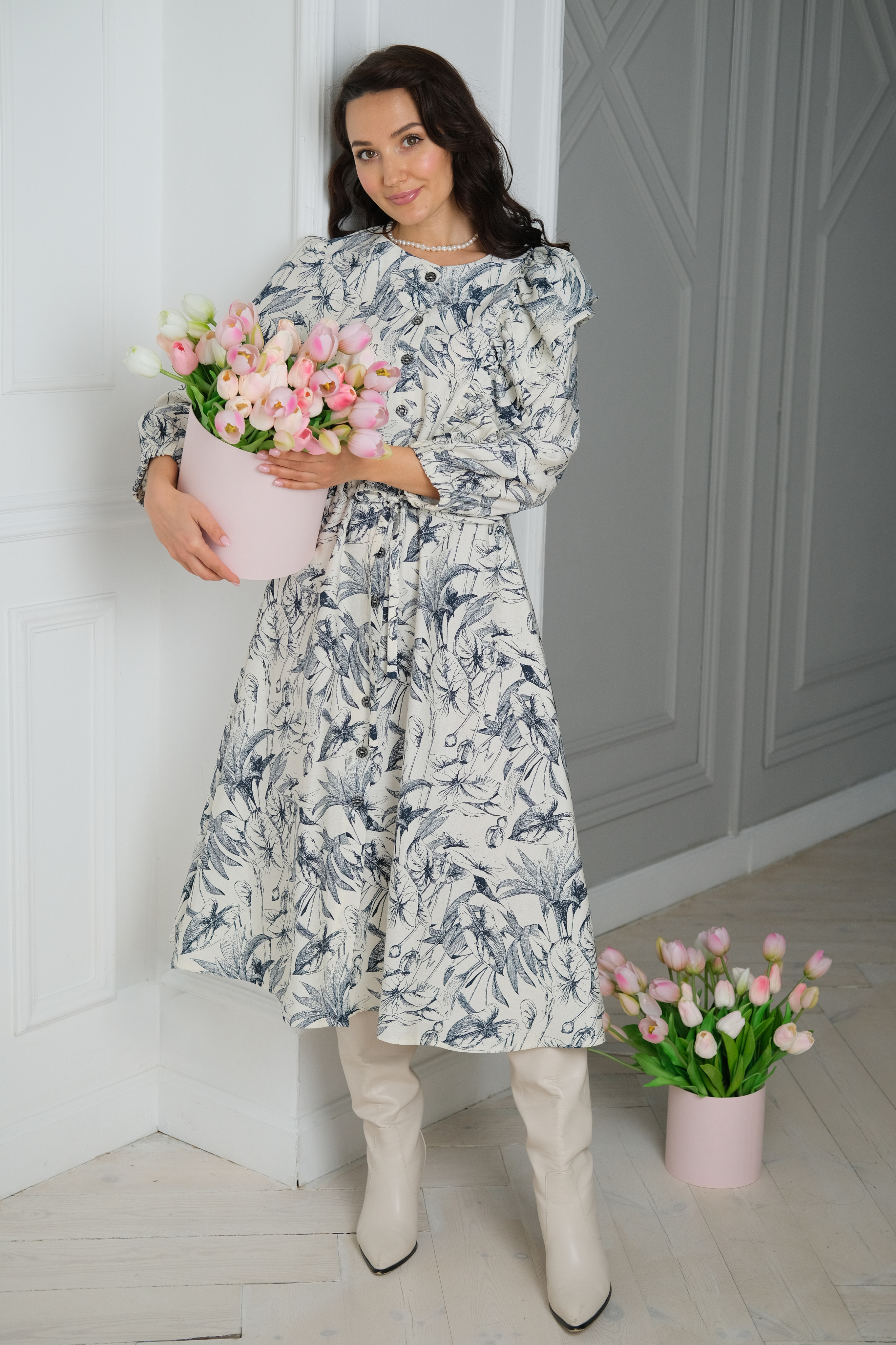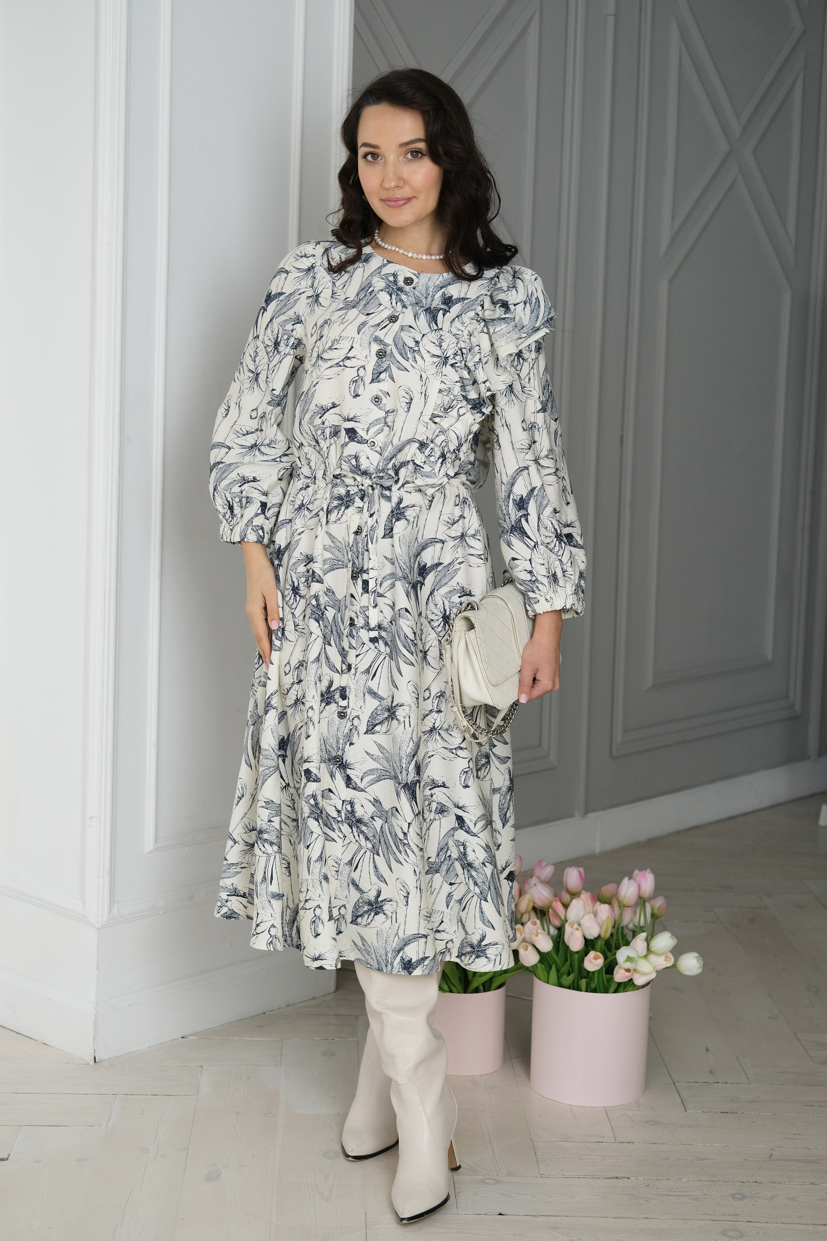 Воздушное платье из струящейся вискозы с нежным и красивым принтом. Модель с умеренной свободой. Широкий укороченный свободный рукав для свободы действий. Необычный крой платья двойной волан по левому плечу. Дополняют образ контрастные пуговицы. Платье отрезное по линии талии и собрано на кулиску. В таком платье вы всегда будете ловить восторженные взгляды.