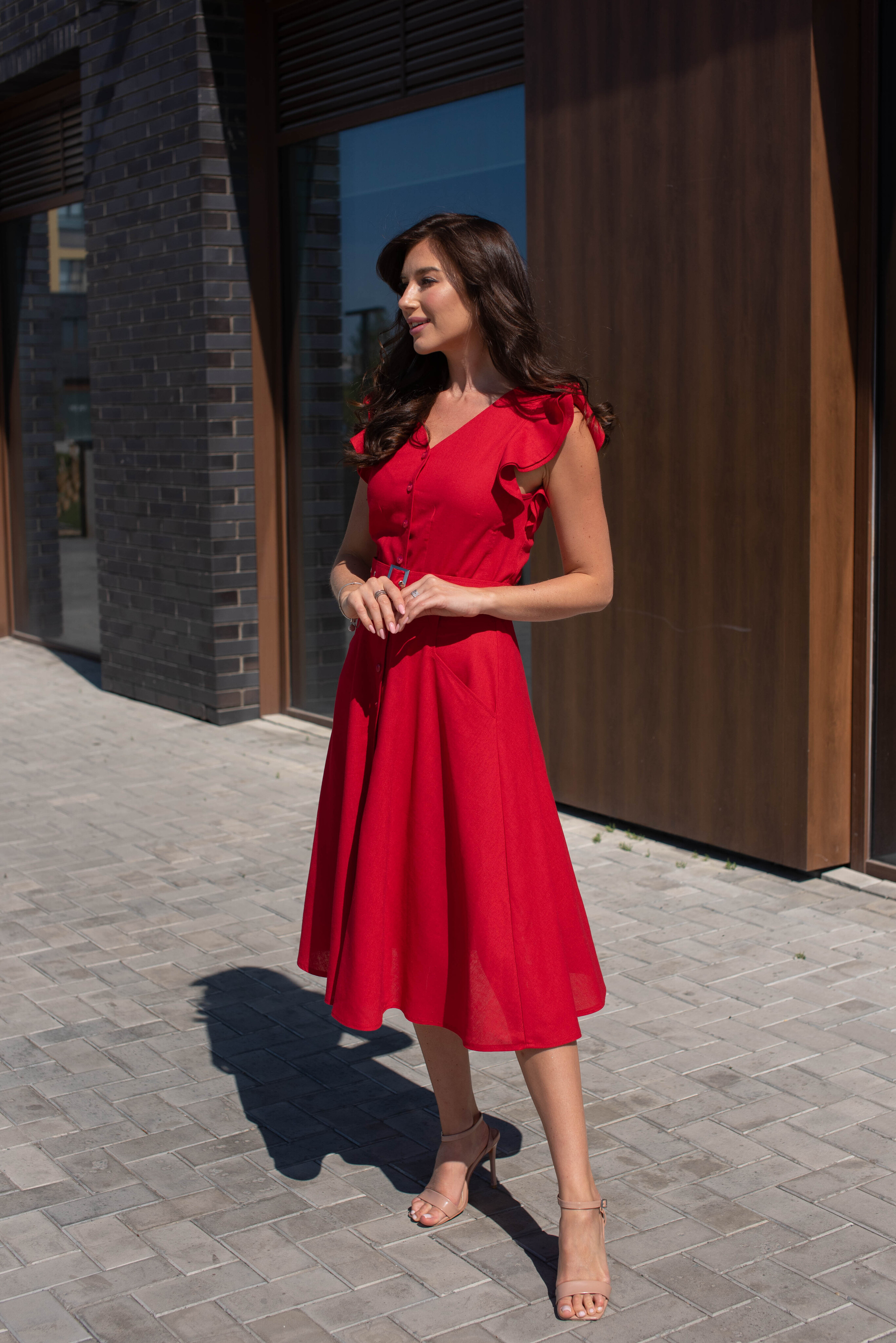 Страстное и обворожительное платье в ярком насыщенном красном цвете. Фасон платья прилегающий, рисует красивый силуэт песочных часов. Романтичные воланы дополняют образ, и делают его запоминающимся. В комплекте ремень с пряжкой. Платье полностью расстегивается, застежка - пуговицы. Спереди на юбке отрезные карманы.