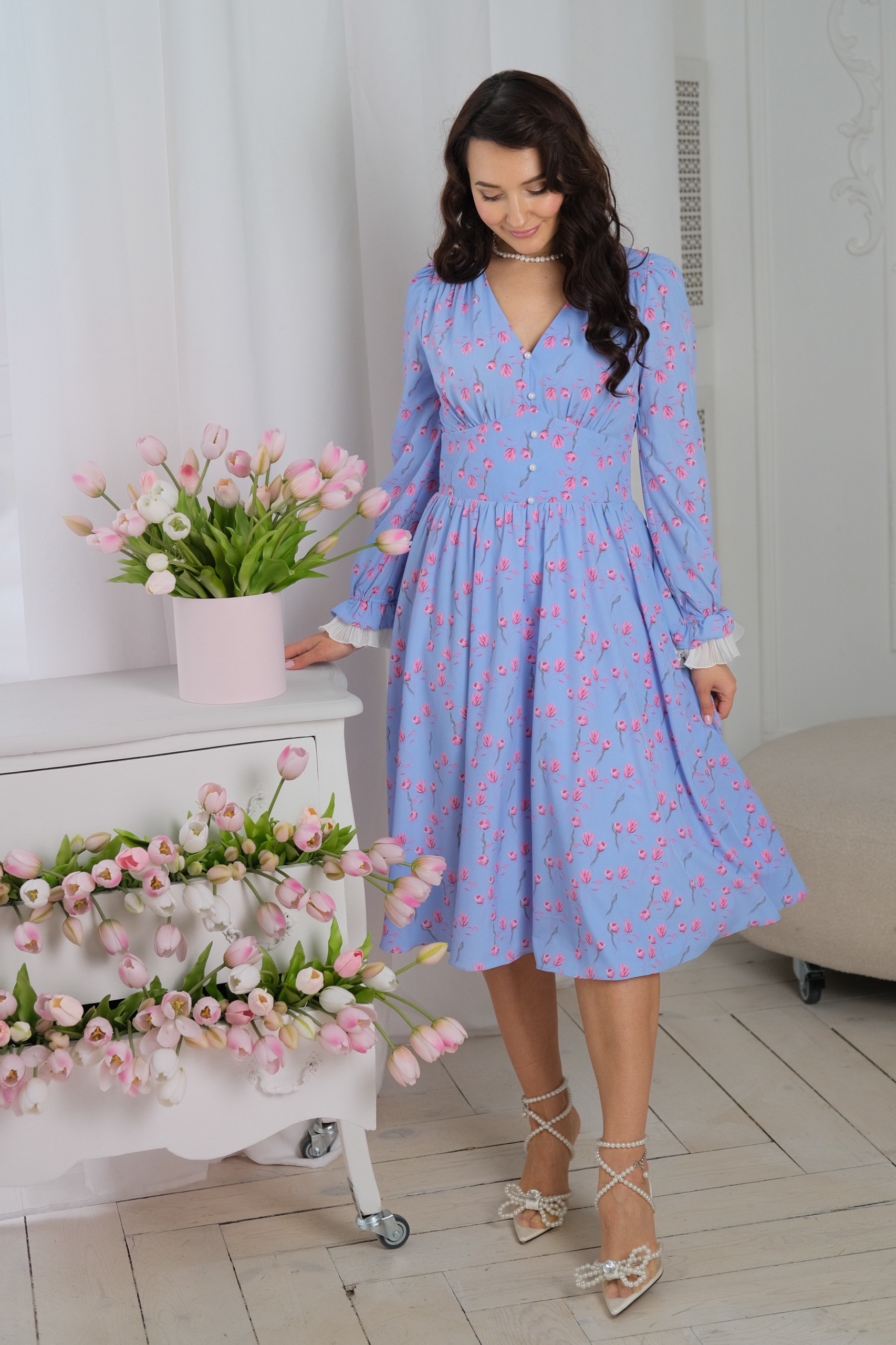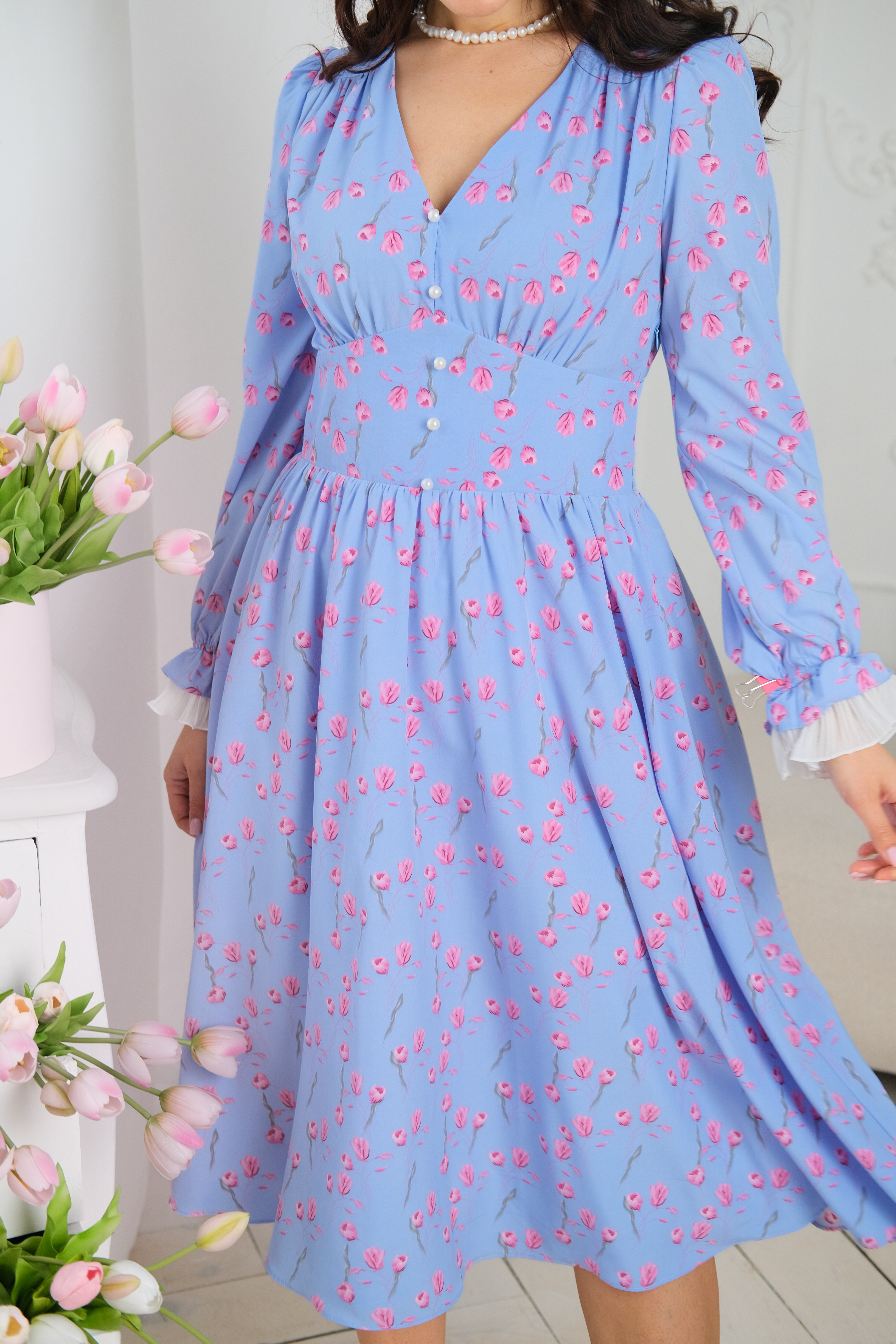 Роскошное платье прилегающего силуэта, с втачными рукавами и контрастными оборками на манжетах. Платье выполнено из легкой, струящейся ткани. Платье отрезное по талии, юбка полусолнце, на плечах декоративные кокетки, V-образный вырез горловины визуально удлиняет линию шеи и создает стройный и хрупкий образ. С покупкой этого платья - Вы получаете нежный, женственный образ для особого случая и на каждый день.