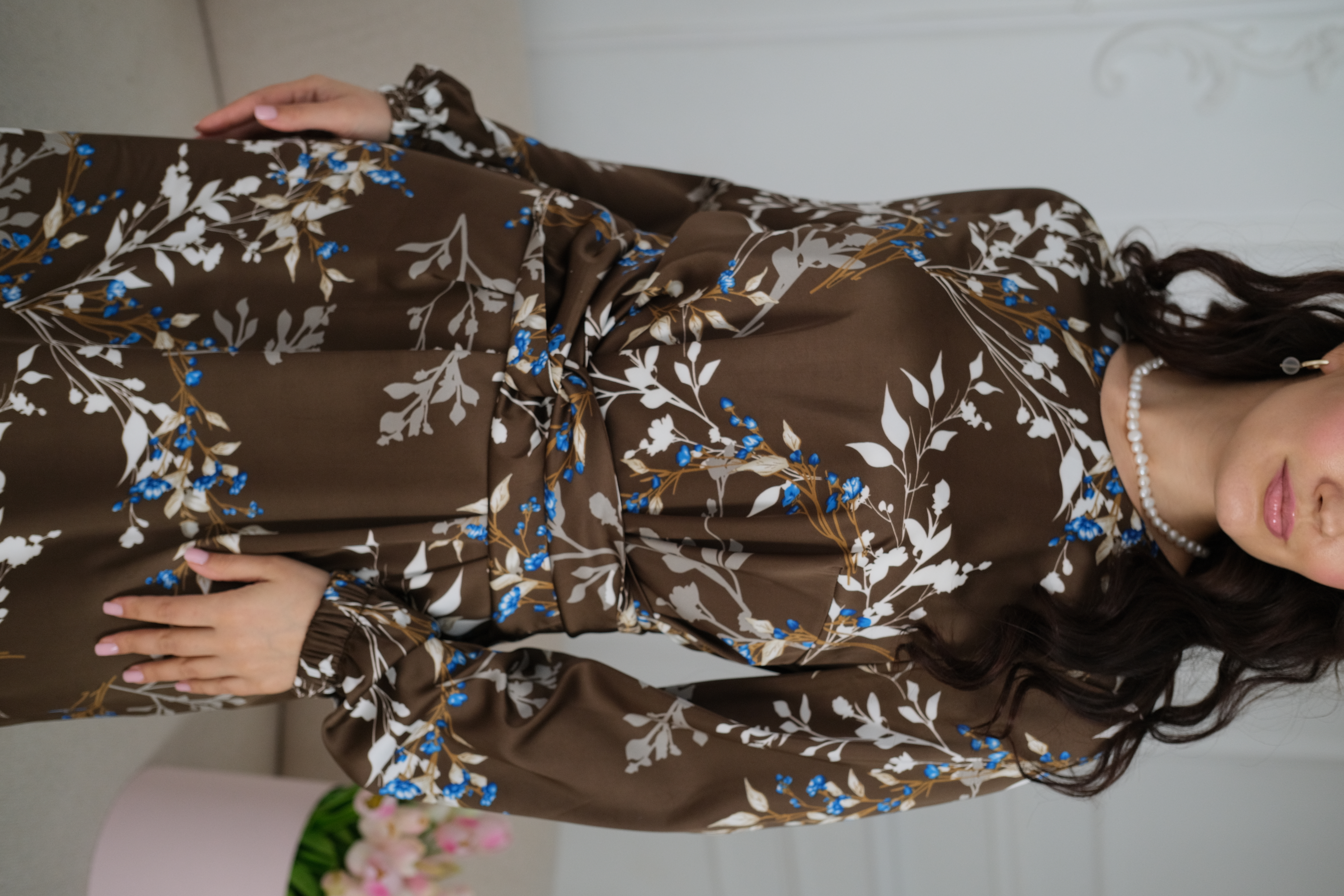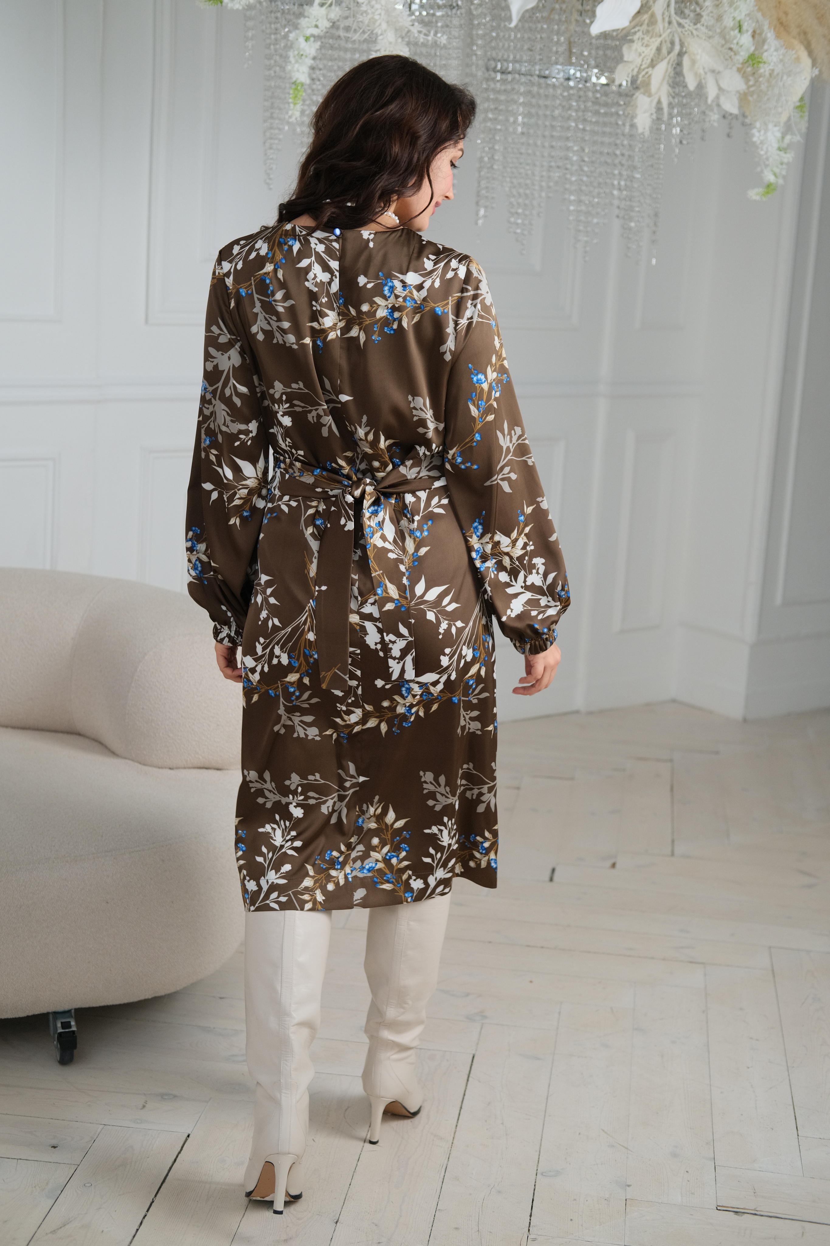 Идеальное платье - романтичное и женственное. Для работы, для походов в театр, для встречи с друзьями в ресторане. Комфортная струящаяся ткань. Модель прямого кроя с умеренной свободой. Круглый вырез горловины. по бокам вшит широкий пояс, который перекрещивается спереди и завязывается за спиной. Втачной рукав внизу собран на широкую мягкую манжету- резинку.