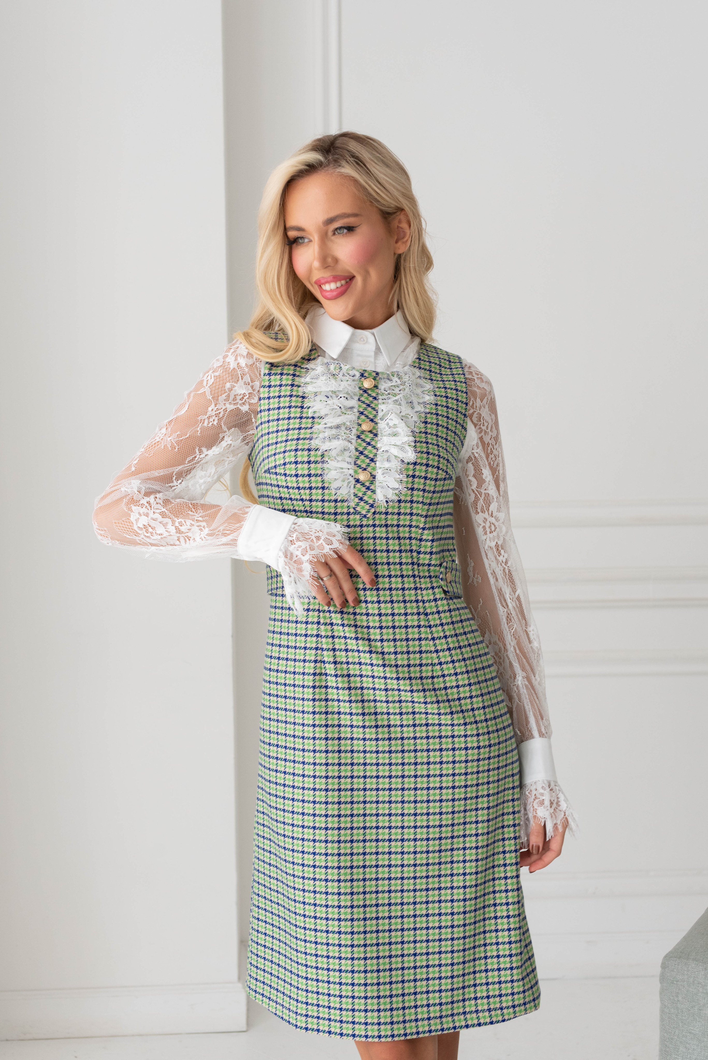 Красивое кружево и элегантный крой - создают романтичное настроение этой весной. Особенность этого платья - декоративный съемный пояс на пуговицах, кружевные рюши и красивые золотистые пуговицы. Получилось гармонично и нежно. Круглый вырез горловины, по спинке потайная молния. Прекрасный крой и идеальная посадка по фигуре в любом размере.