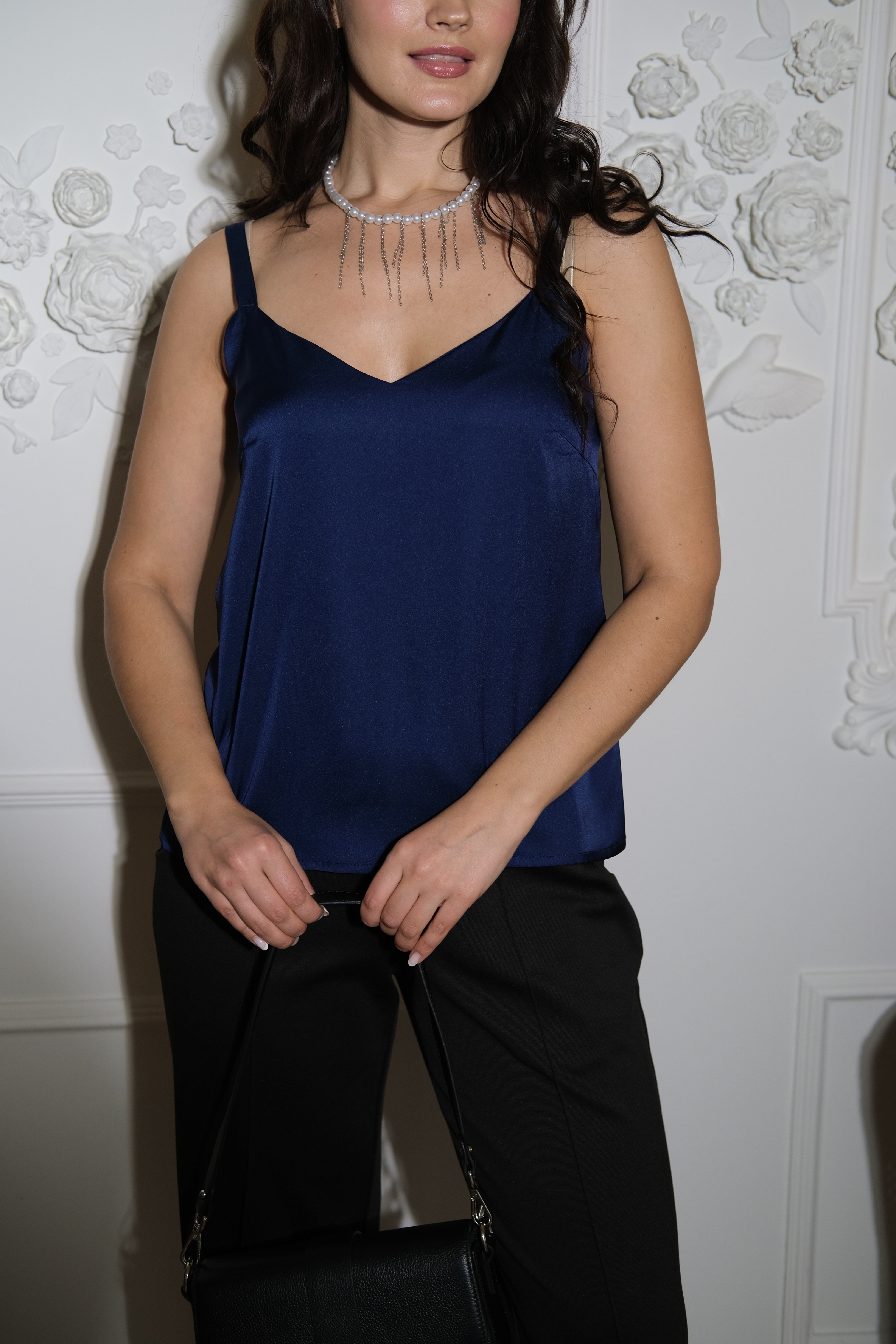 Базовый топ из шелковистой ткани на основе вискозы. Топ исполнен с V-образным вырезом и тонкими бретелями. Ткань очень приятная к телу. перед топа выполнен с подкладкой. Создавайте различные образы с этим удобным и универсальным топом.