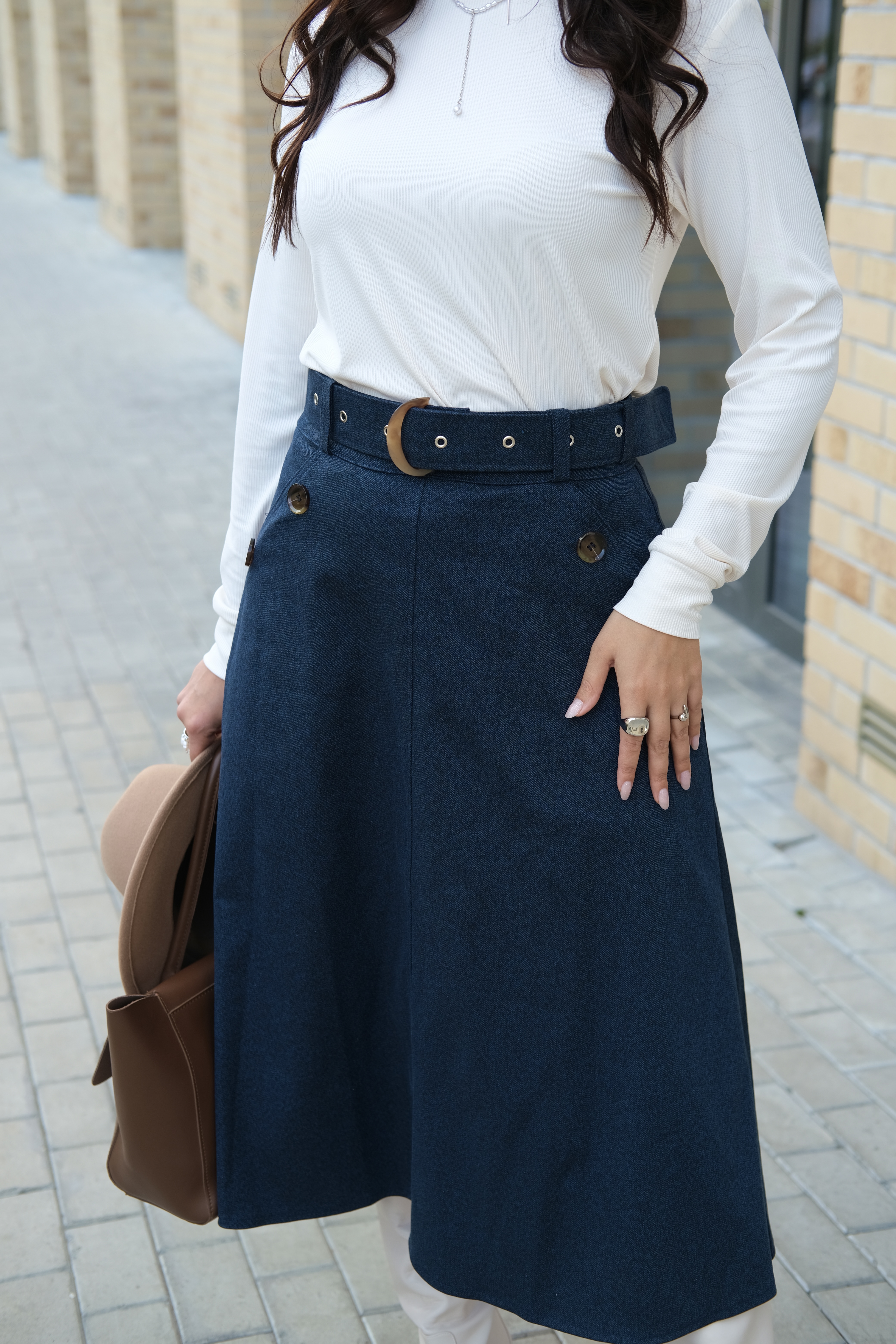 Юбка А-силуэта с отрезными карманами. Юбка выполнена с декоративным швом спереди. Карманы украшают контрастные пуговицы. В комплекте съемный ремень с контрастной пряжкой. Юбка прекрасно сочетается с любыми топами, блузками, рубашками, джемперами. Это отличное вложение в ваш базовый гардероб.