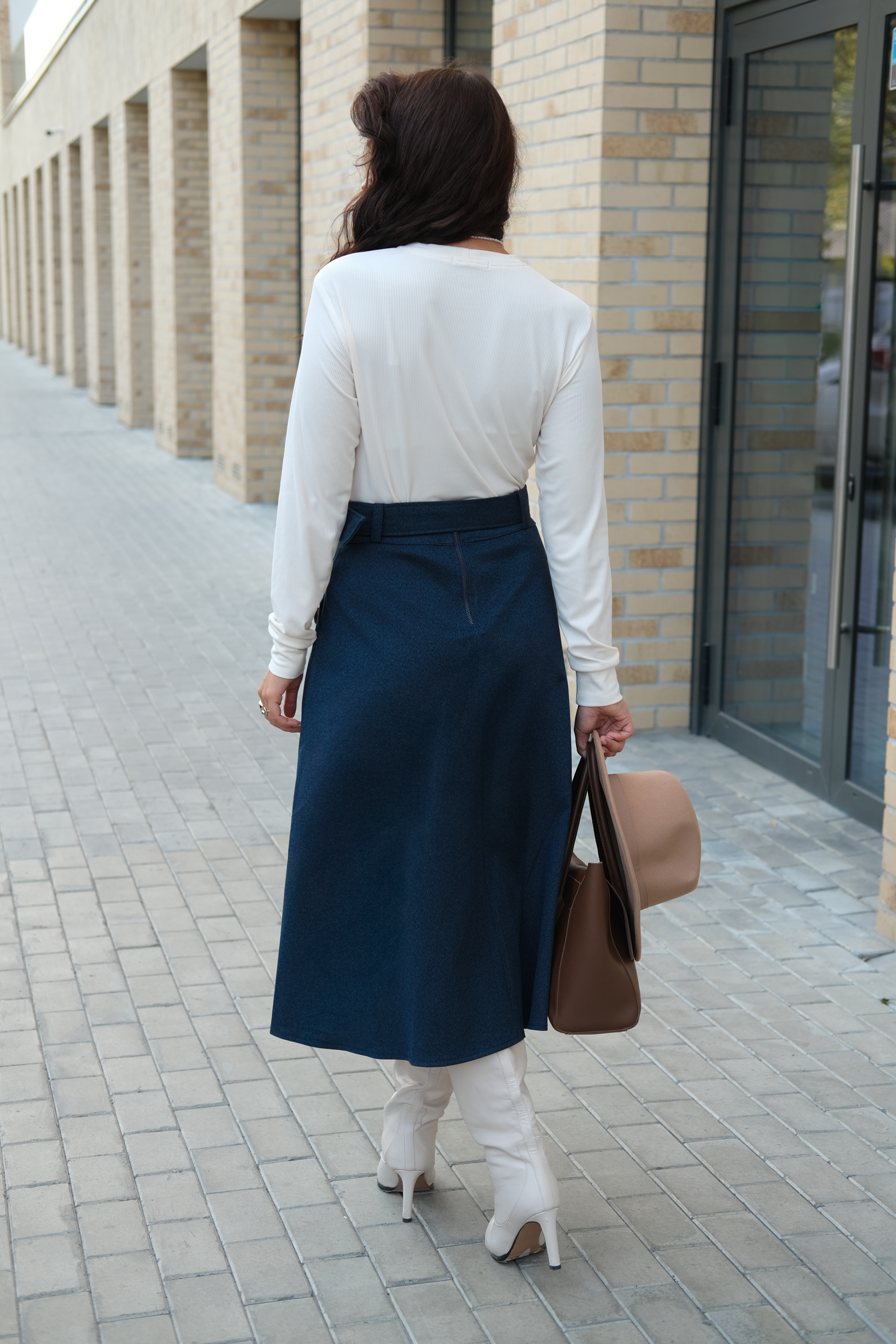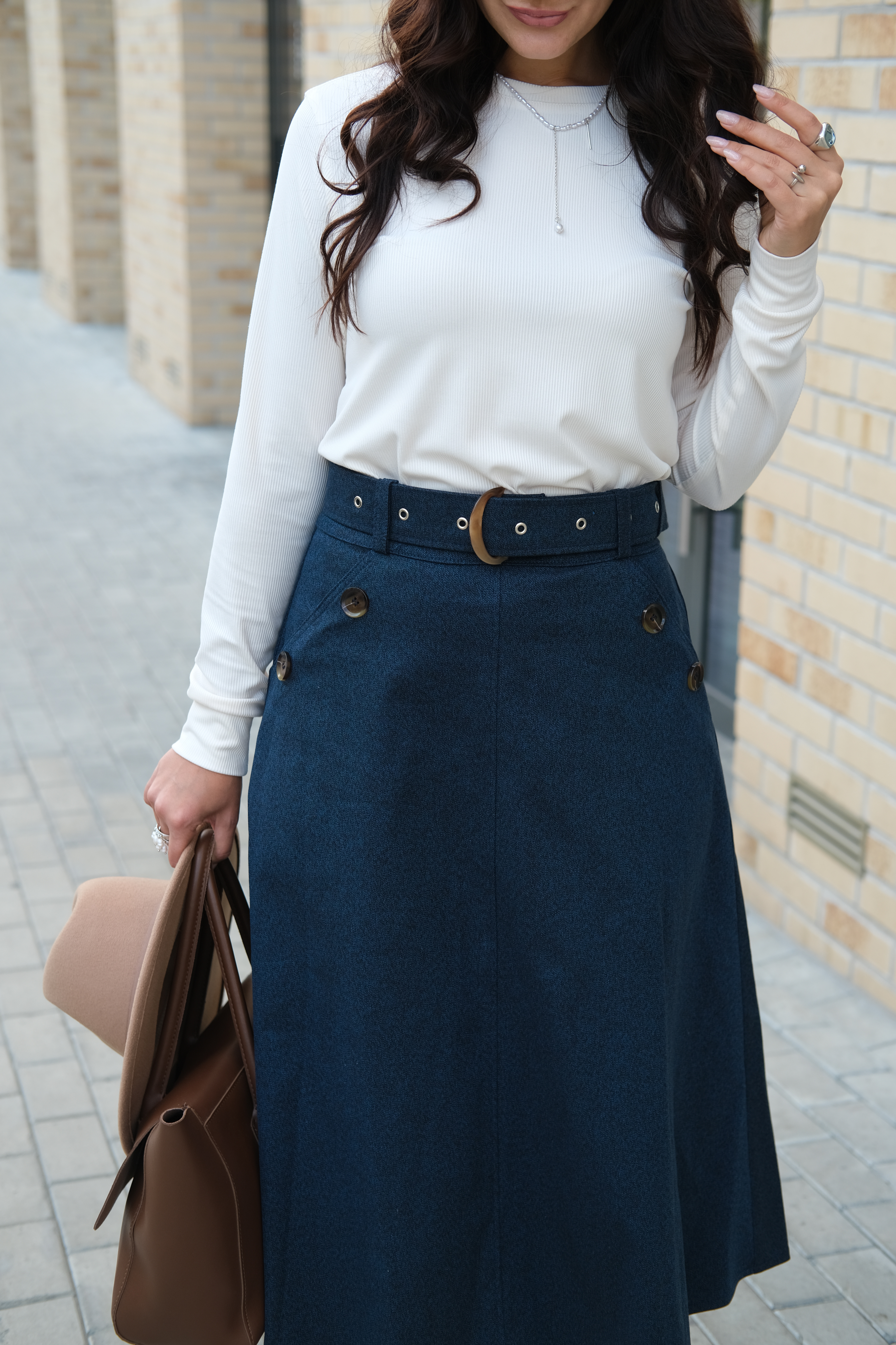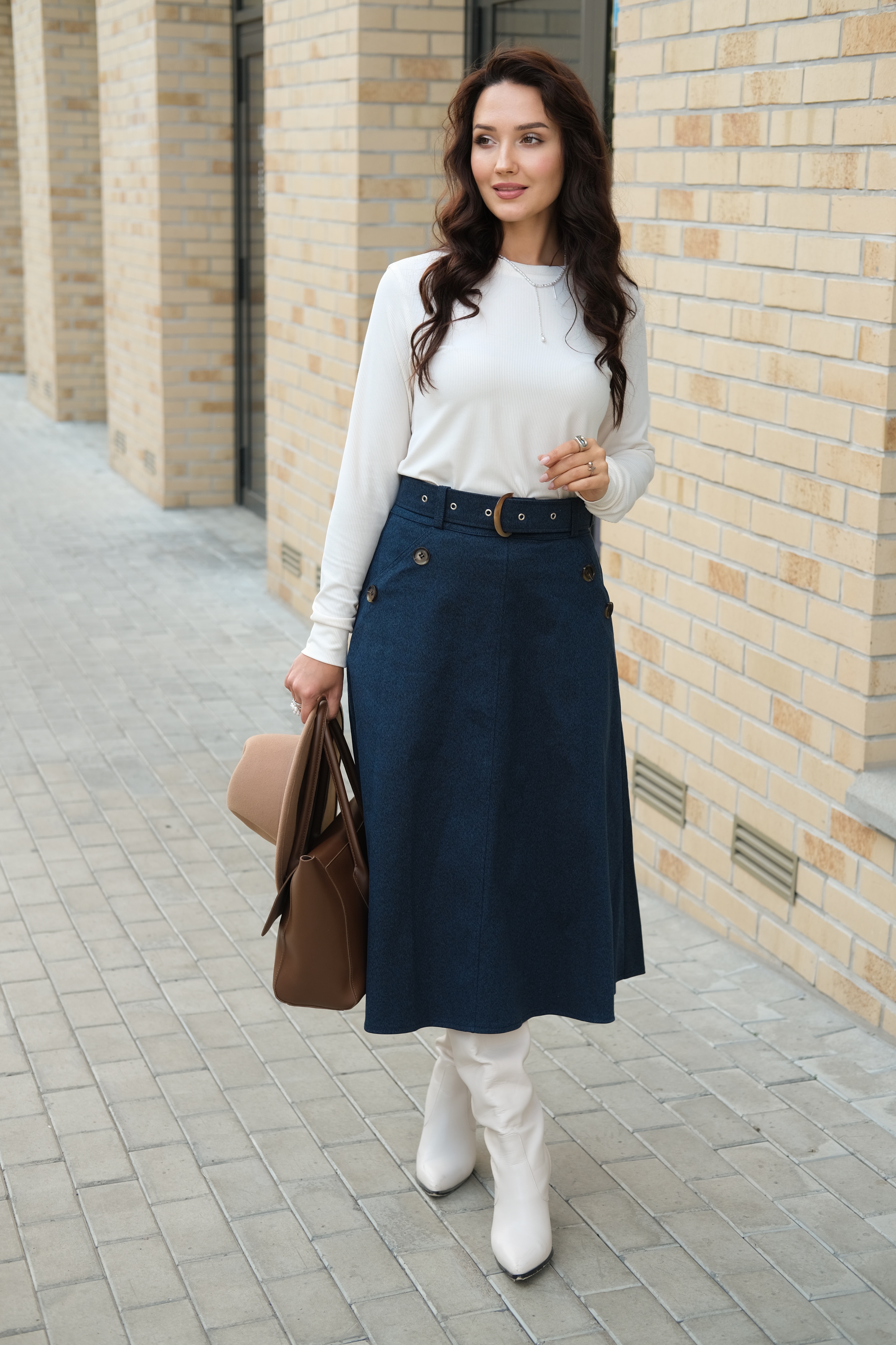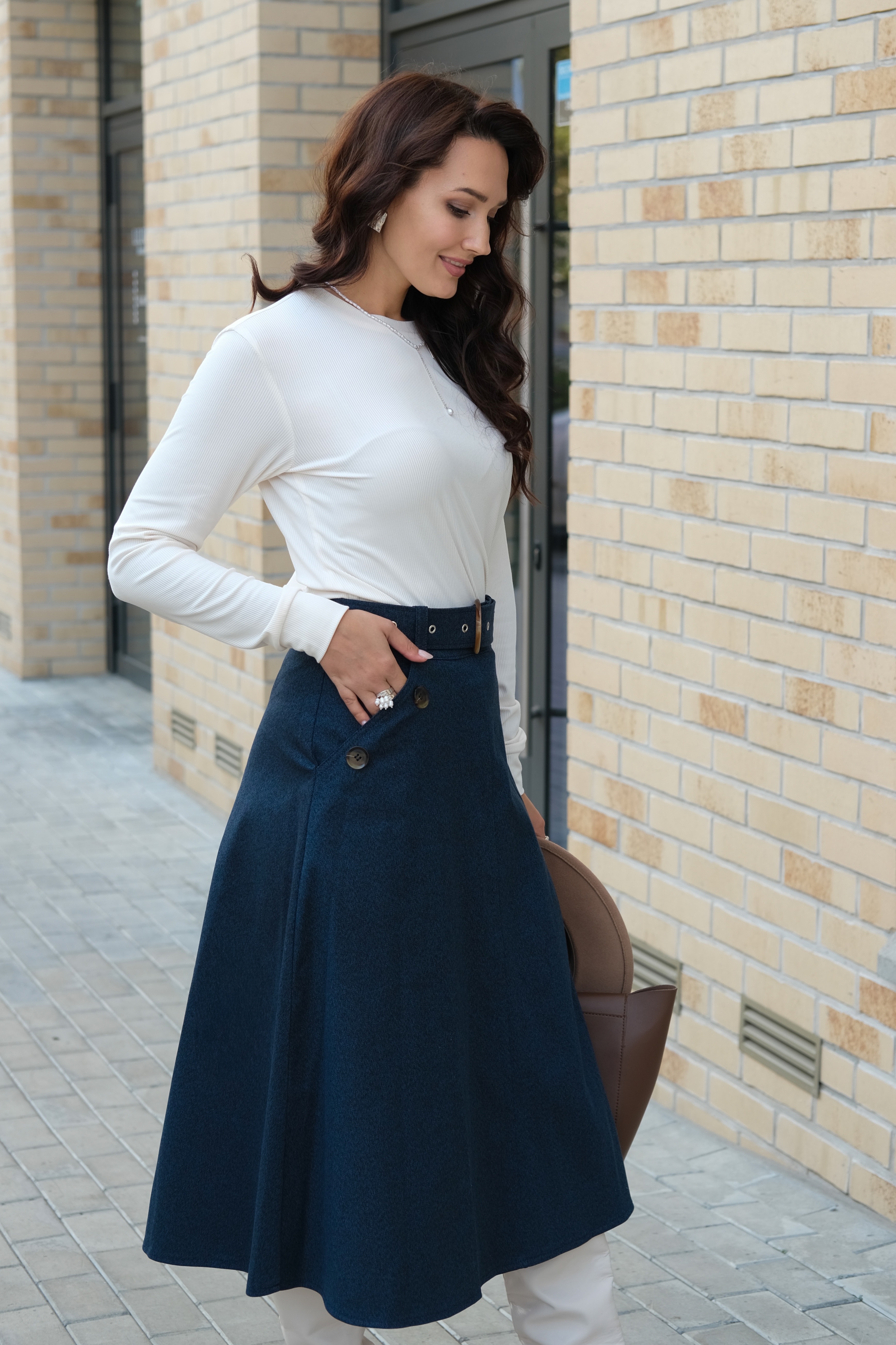 Юбка А-силуэта с отрезными карманами. Юбка выполнена с декоративным швом спереди. Карманы украшают контрастные пуговицы. В комплекте съемный ремень с контрастной пряжкой. Юбка прекрасно сочетается с любыми топами, блузками, рубашками, джемперами. Это отличное вложение в ваш базовый гардероб.